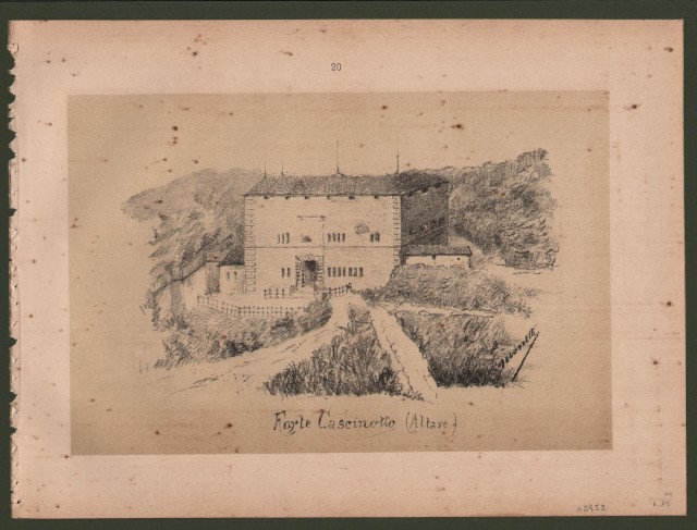 LIGURIA, Forte Cascinotto (Altare). Veduta generale. Incisione realizzata attorno al 1890 in litografia e stampata in nero su fondo seppia. Misura mm 240x160 più margini bianchi ed è contenuta in tavola fuori testo di mm 290x220. (Rif.A5952-466/44)
