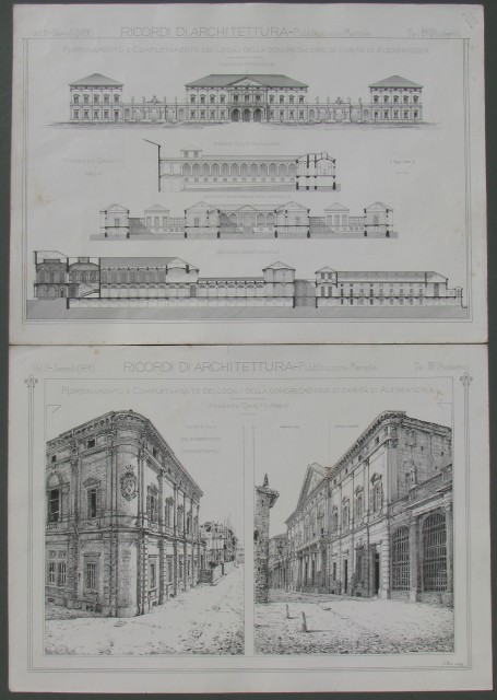 ALESSANDRIA. Riordinamento e completamento della congregazione di carità . Insieme di due tavole molto decorative recanti vedute esterne, prospetti e sezioni. Ciascuna misura mm 530x380. Da Ricordi di Architettura, anno 1891. (Rif.A6883-395/45)