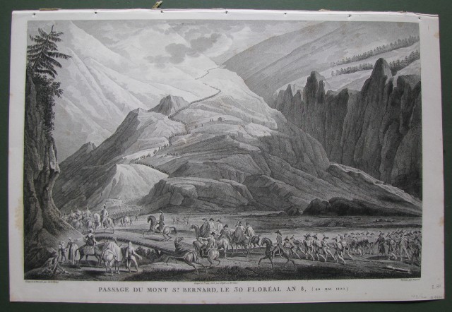 Bella veduta animata con in primo piano gruppo di fanti e cavalieri ed alcuni popolani. Sullo sfondo le Alpi. Mm 422x275 più margini (complessivamente mm 470x310). Splendida tavola assai decorativa, disegnata da Carle Vernet ed incisa da Duplessis-Bertaux tratta da un'impressione, databile attorno alla metà del 1800, dell'opera edita a Parigi Victoires et conquetes de la Republique Francais. Album des batailles, des campagnes d'Italie, d'Egypte et de Hollande. (Rif.A1711)