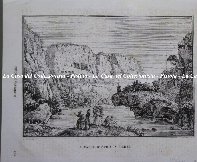 SICILIA. La valle d'Ispica. Animata pittoresca veduta. Xilografia di mm 192x135. Anno 1835. Tratta dal Cosmorama Pittorico famosa rivista illustrata della prima metà del 1800. Viene proposta montata in passe-partout. (Rif.A2770 - Sicilia)