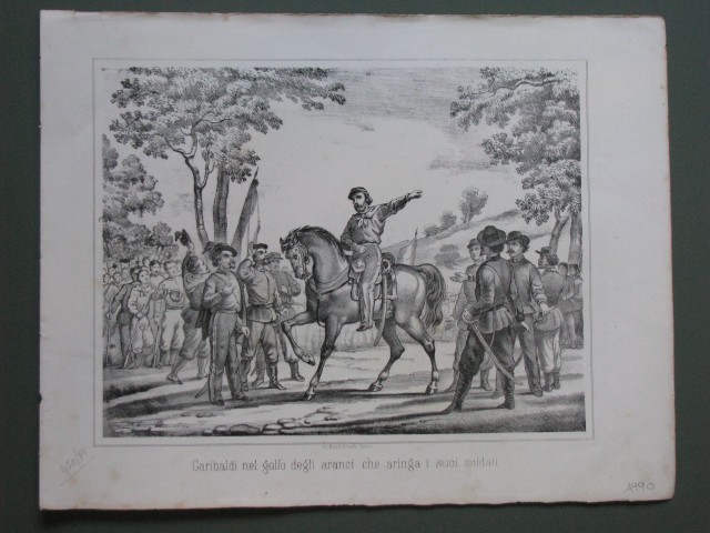 L'eroe arringa i suoi soldati nel Golfo Degli Aranci. Mm 280x225 più margini. Bella incisione, realizzata in litografia fuori testo e su carta pesante, tratta dall'album Garibaldi nelle Due Sicilie o sia Guerra del 1860 realizzato dai F.lli Terzaghi a Milano attorno al 1870. (Rif.A990-450/39 - Sicilia - Palermo)