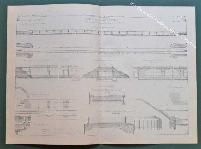 ABRUZZO, tratto ferroviario tra S. Benedetto del Tronto e Pescara. "Ponte sul fiume Vomano”. Grande e bella tavola doppia di mm 545x400, tratta da Giornale del Genio Civiledel 1864, con prospetto generale del ponte, pianta, sezioni e particolari. (Rif.D3839 - 302/67)