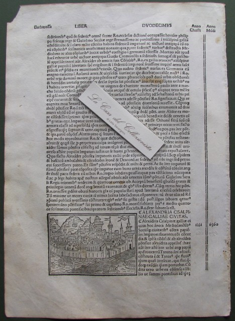 ALESSANDRIA. Alexandria Cisalpinae Galliae Civitas, veduta generale. Xilografia di mm 84x58. Contenuta in foglio originale (piccola mancanza di carta ad un angolo) di mm 215x305. Anno 1503. Tratta da Supplementum supplementi chronicarum opera di Jacopo Filippo Foresti, detto il Bergomensis. (Rif.B860-203/49)