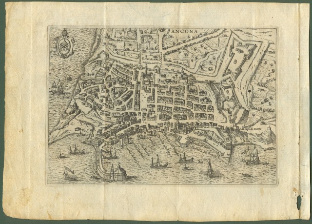 ANCONA. La città ed il suo porto visti a volo d'uccello. Graziosa veduta arricchita da molte navi in mare. Tratta da Itinerario d'Italia di Francesco Scoto. Mm 177x121 più marg. (complessiv. mm 225x170). (Rif.A5057-221/43)