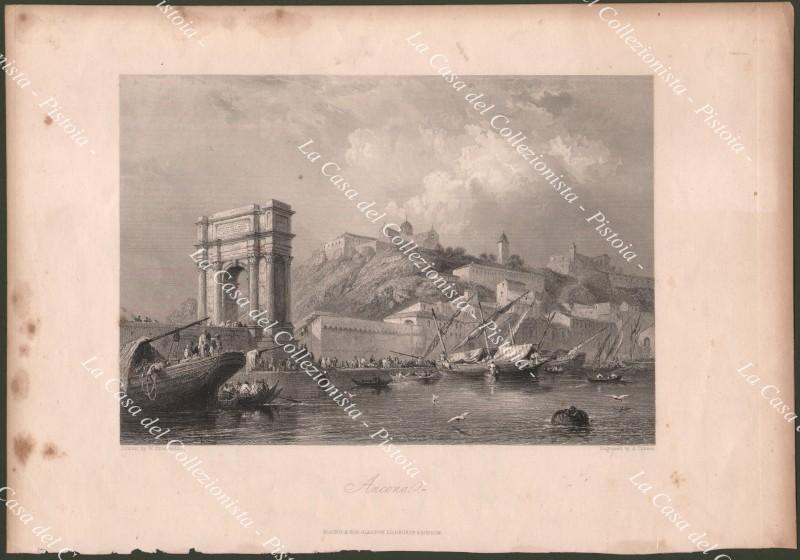 ANCONA. Splendida veduta del porto con grande animazione tratta dall'opera di William Brockedon Italy, classical, historical, and picturesque, edita a Londra attorno al 1840. Mm 226x157 più margini. Qualche ingiallimento laterale. (Rif.B8342)