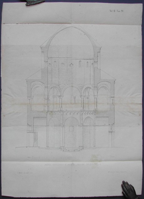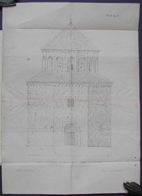 Antico battistero in Azzago presso Somma in Lombardia. Due tavole fuori testo ripiegate (mm 250x340 ciascuna) con facciata e sezione. Unito l'articolo relativo tratto dal Giornale dell'Ingegnere Architetto del 1863. (Rif.A8159-324/47)