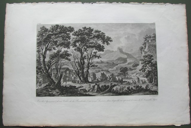 BASILICATA, Vue des Appenins et dune vallée de la Basilicate..dans laquelle ou appercoit le cours de l'Acyris et du Syria. Grande e decorativa veduta panoramica con primo piano di gruppo di artisti intenti a disegnare ed una vallata con fiume e monti sullo sfondo. Mm 340x205 più ampi margini. Realizzata su carta vergellata proviene dall'edizione del 1836 dell'opera di Saint-Non VOYAGE PITTORESQUE A NAPLES ET EN SICILE. Splendida e fresca conservazione. (Rif.A1531-299/39 Basilicata)