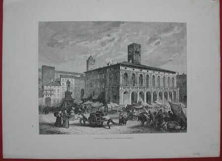 BOLOGNA. Place de la fontaine de Neptune a Bologne. Panoramica veduta molto animata. Mm 242x183 più marg.. Tratta dal Gourdault. (Rif.A698-590/39 - Bologna)