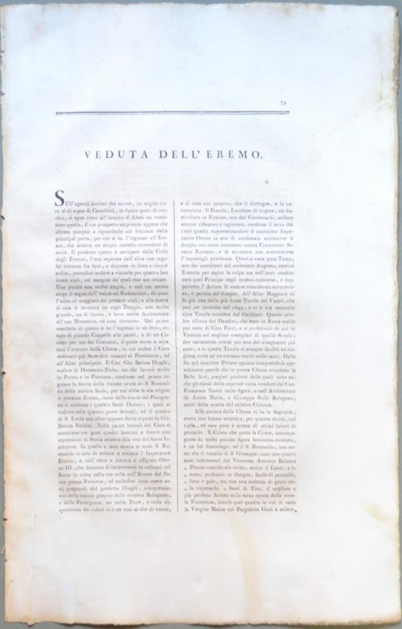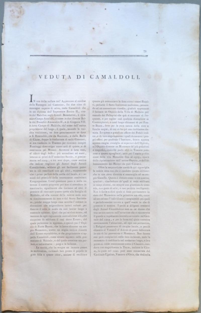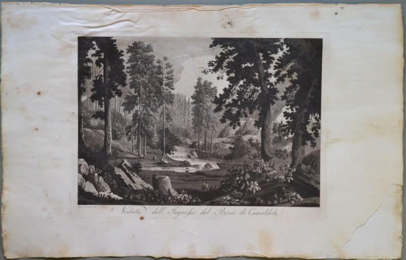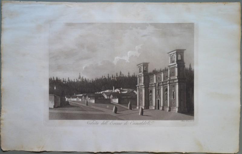 CAMALDOLI (Arezzo). Insieme di due vedute disegnate e incise all'acquatinta da Antonio Terreni: 1) "Veduta di Camaldoli", panoramica vista dell'eremo e dei suoi dintorni. 2) "Veduta dell'Eremo di Camaldoli". Ciascuna di mm 340x230 (ai marg. mm 560x355). Unite le due pagine di testo relative. Buona conservazione eccetto qualche fioritura e ingiallimento sui bordi bianchi. Splendide vedute incise su rame con la tecnica dell'acquatinta su disegno di Antonio Terreni e tratte dall'opera "Viaggio Pittorico della Toscana" edita in Firenze tra il 1801 ed il 1803 da Giuseppe Tofani. UNITA altra tavola raffigurante la "Veduta dell'ingresso del Bosco di Camaldoli" (sui margini: mancanza di un angolo di carta, fioriture e ingiallimenti). (Rif.B3801-238/51)