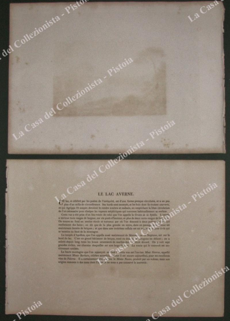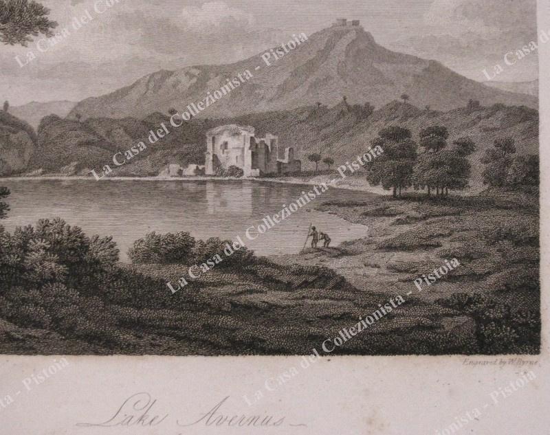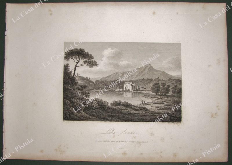 Campania. LAGO AVERNO. ANNO 1799. "Lake Avernus", panoramica veduta del lago. Fine incisione realizzata con la tecnica dell'acquaforte tratta dall'opera di J. Smith "Select views in Italy" edita a Londra nel 1796. Mm 190x127 (ai margini 360x260). Unita la pagina descrittiva. Ottima conservazione, lievi ingiallimenti laterali. (Rif.B8102-244/61)