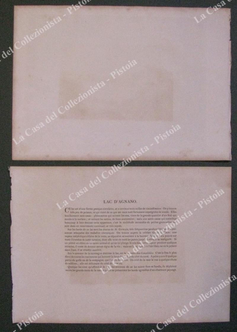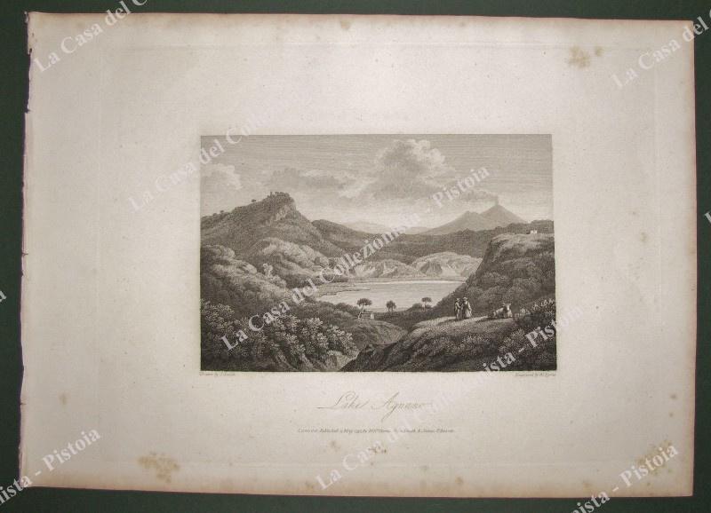 Campania. LAGO DI AGNANO. ANNO 1799. "Lake Agnano", bella veduta generale col Vesuvio sullo sfondo. Fine incisione realizzata con la tecnica dell'acquaforte tratta dall'opera di J. Smith "Select views in Italy" edita a Londra nel 1796. Mm 190x127 (ai margini 360x260). Unita la pagina descrittiva. Buona conservazione, ingiallimenti sul margine bianco inferiore. (Rif.B8105-247/61)