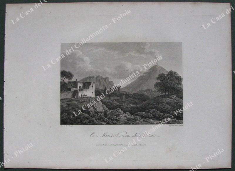 Campania. VESUVIO, Napoli. "On mount Vesuvius above Portici", bella veduta del vulcano presa dalla campagna dove sorgeva Ercolano. Fine incisione realizzata con la tecnica dell'acquaforte tratta dall'opera di J. Smith "Select views in Italy" edita a Londra nel 1796. Mm 190x127 (ai margini 360x260). Unita la pagina descrittiva. Buona conservazione. (Rif.B8110-251/61)