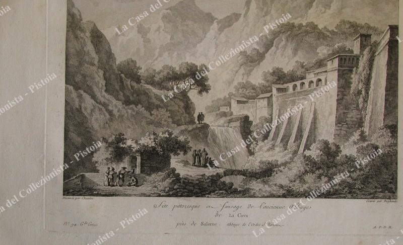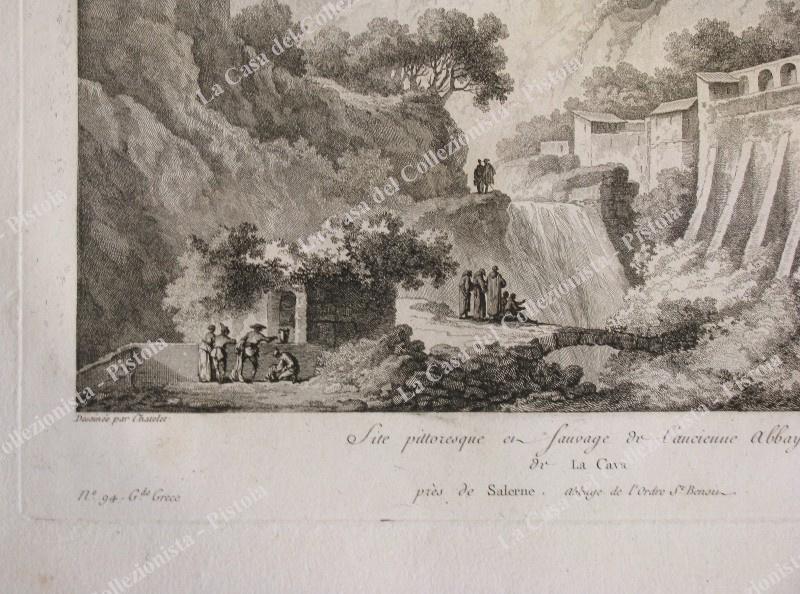 CAVA DEI TIRRENI, Salerno. Pittoresca veduta dell'abbazia. Dal Saint Non, prima edizione 1781. Acquaforte di mm 230x155 (ai margini 340x275). Buona conservazione. (Rif.F0137)