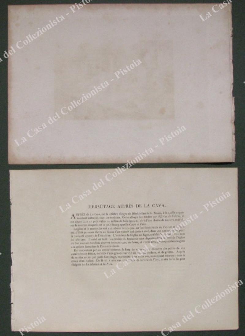CAVA, Salerno. Anno 1799. "Hermitage near La Cava", pittoresca veduta dell'Abbazia. Fine incisione realizzata con la tecnica dell'acquaforte tratta dall'opera di J. Smith "Select views in Italy" edita a Londra nel 1796. Mm 192x125 (ai margini 360x260). Unita la pagina descrittiva. Ottima conservazione, lievi bruniture laterali. (Rif.B8115-256/61)