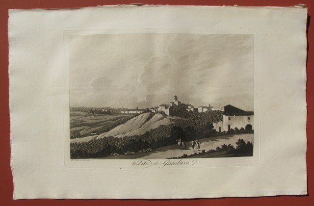 FIRENZE. Veduta di Gambassi (Firenze). Splendida e decorativa incisione fuori testo realizzata con la tecnica dell'acquatinta. Disegnata ed incisa da Antonio Terreni. Misura mm 342x229 più margini (complessivamente mm 565x360). Proviene dall'opera Viaggio Pittorico della Toscana, edita in Firenze presso Giuseppe Tofani e uscita in tre volumi tra il 1801 e il 1803. Viene unita la pagina originale che conteneva la descrizione della tavola. Ottima e fresca conservazione. (Rif.B1546)