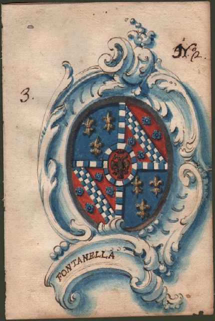 FONTANELLA di REGGIO così ridotto l'anno 1628. Splendido acquarello settecentesco raffigurante lo stemma della famiglia.