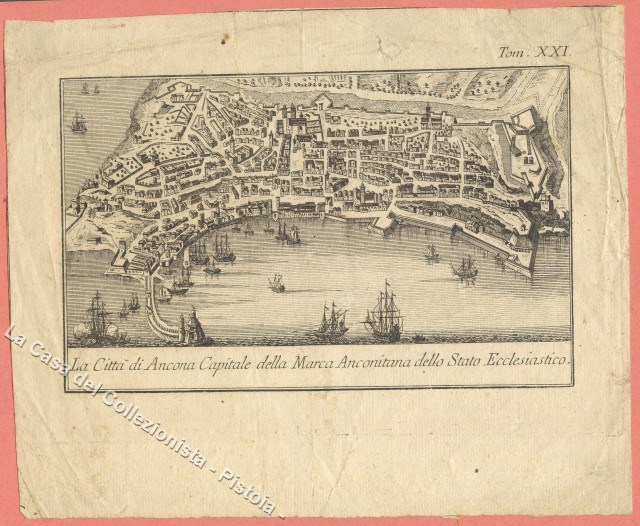 MARCHE - ANCONA. "La Città di Ancona Capitale della Marca Anconitana dello Stato Ecclesiastico". Veduta generale a volo d'uccello, navi in mare. Mm 152x93 (ai marg. 183x145). Piccoli difetti sui margini bianchi. L'incisione, realizzata con la tecnica dell'acquaforte, è tratta dall'opera Lo Stato di tutti i Paesi e Popoli del Mondo Naturale, Politico e Morale con nuove osservazioni e correzioni degli Antichi e Moderni Viaggiatori scritto in inglese dal Signor Thomas Salmon, stampata in Venezia, presso Giambattista Albrizzi, tra il 1737 ed il 1766 in 26 volumi. (Rif.B8307-220/57)