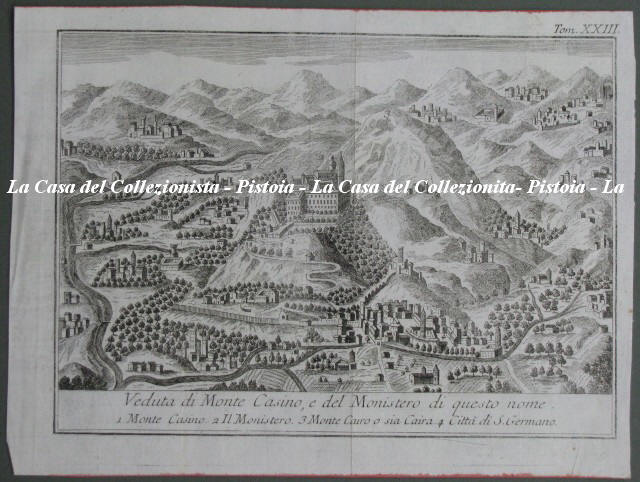 LAZIO - MONTECASSINO. "Veduta di Monte Casino, e del Monistero di questo nome". Veduta generale. Incisione all'acquaforte tratta da "Lo Stato Presente di tutti i Paesi e Popoli del Mondo Naturale, Politico, e Morale con nuove osservazioni e correzioni degli Antichi e Moderni Viaggiatori". Importante opera di viaggi stampata in Venezia, presso Giambattista Albrizzi, tra il 1737 ed il 1756. Mm 223x160 (ai margini 246x185), più volte ripiegata. Ottima conservazione. (Rif.B6217-128/53)