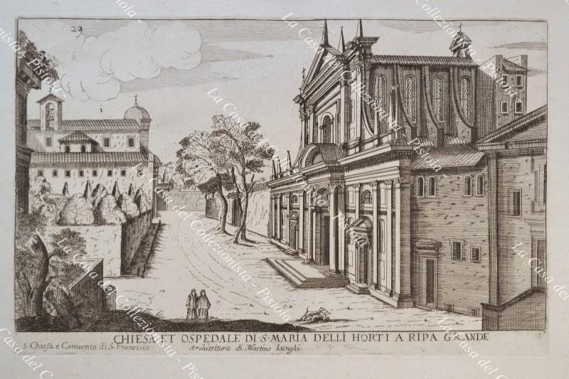 Lazio - Roma. CHIESA ET OSPEDALE DI S. MARIA DEGLI ORTI A RIPA GRANDE. Incisione realizzata con la tecnica dell'acquaforte di Matteo Gregorio Rossi tratta dall'opera "Del Nuovo Splendore delle Chiese di Roma Moderna in Prospettiva", edita a Roma nel 1686. Mm 285x180 (ai margini mm 420x260). Buona conservazione. (Rif.D8352)
