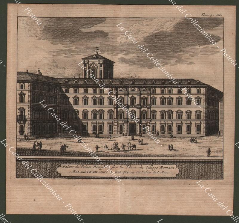 LAZIO - ROMA. "Palais du Pamphile fur la Place du College Romain...". Incisione all’acquaforte e tratta dall’opera di De Rogissart ”Les delices de l’Italie” stampata ad Amsterdam nel 1707. Misura mm 155x120 più margini. Ottima conservazione. (Rif.D6068)