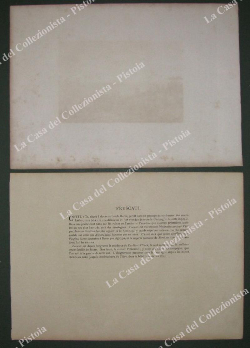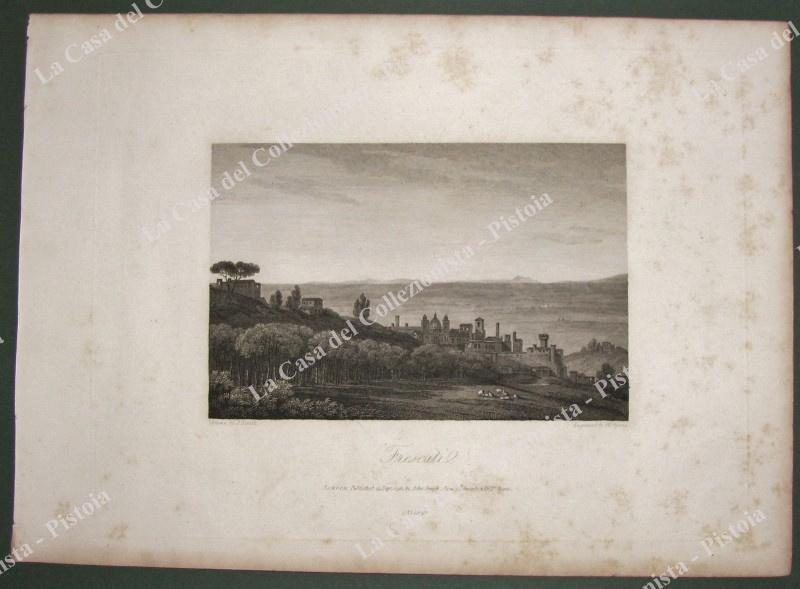 Lazio. FRASCATI. ANNO 1799. "Frescati", bella veduta generale. Fine incisione realizzata con la tecnica dell'acquaforte tratta dall'opera di J. Smith "Select views in Italy" edita a Londra nel 1796. Mm 192x123 (ai margini mm 360x260). Buona conservazione, lievi ingiallimenti. Unita la pagina descrittiva. (Rif.B8089-259/61)