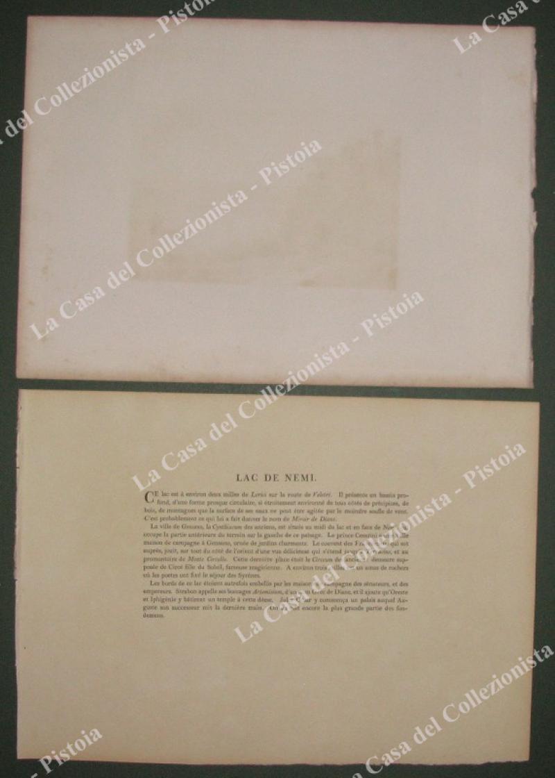 Lazio. LAGO DI NEMI. ANNO 1799. "Lake of Nemi", bella veduta generale, sulla sinistra Nemi e sullo sfondo Gensano. Fine incisione realizzata con la tecnica dell'acquaforte tratta dall'opera di J. Smith "Select views in Italy" edita a Londra nel 1796. Mm 190x127 (ai margini 360x260). Ottima conservazione. Unita la pagina descrittiva. (Rif.B8094-264/61)