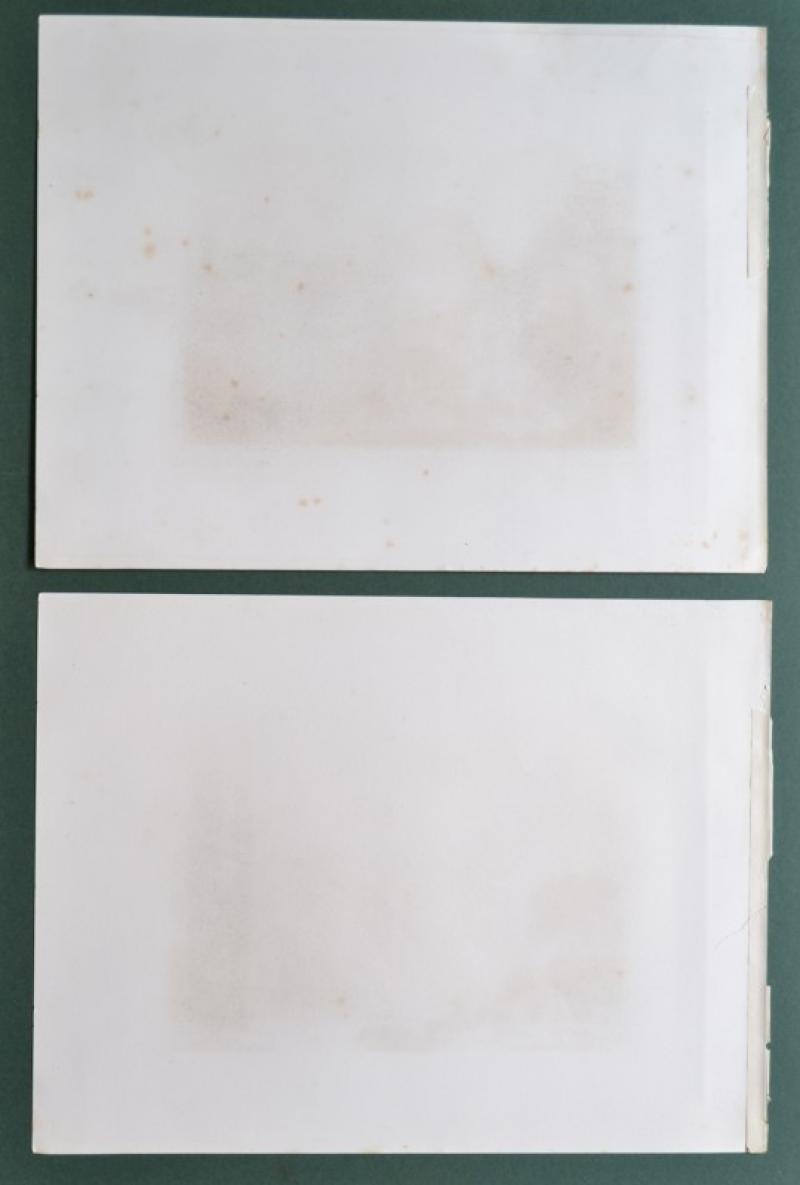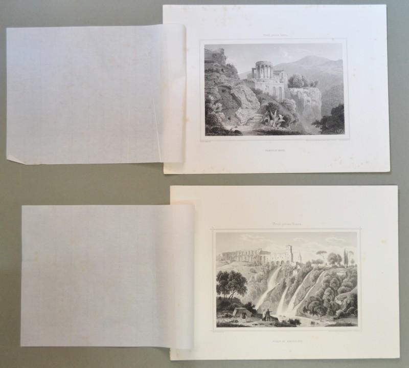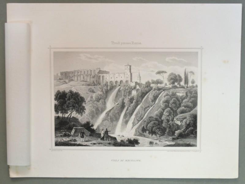 LAZIO, TIVOLI. Insieme di 2 vedute assai belle e decorative: Tempio di Vesta e Villa Mecenate. Ciascuna mm 190x125, ai margini 310x230. Finissime incisioni, protette da velina, tratte da ALBUM VON ITALIEN edito a Trieste dal Lloyd Austriaco attorno al 1855. Ottima conservazione. (Rif.D4915)