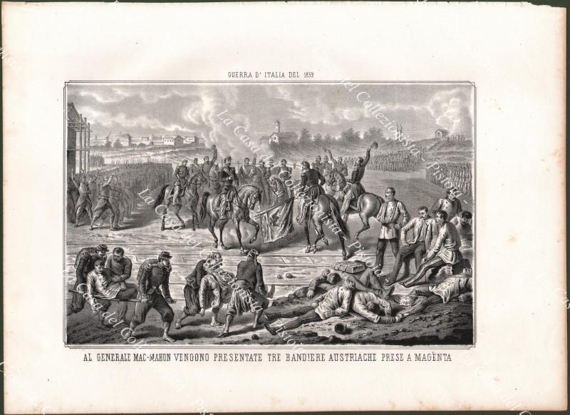 LOMBARDIA - MAGENTA. Al Generale Mac Mahon vengono mostrate le bandiere prese agli austriaci. Grande incisione col paese sullo sfondo. Dall'opera di Domenico Valente, anno 1860