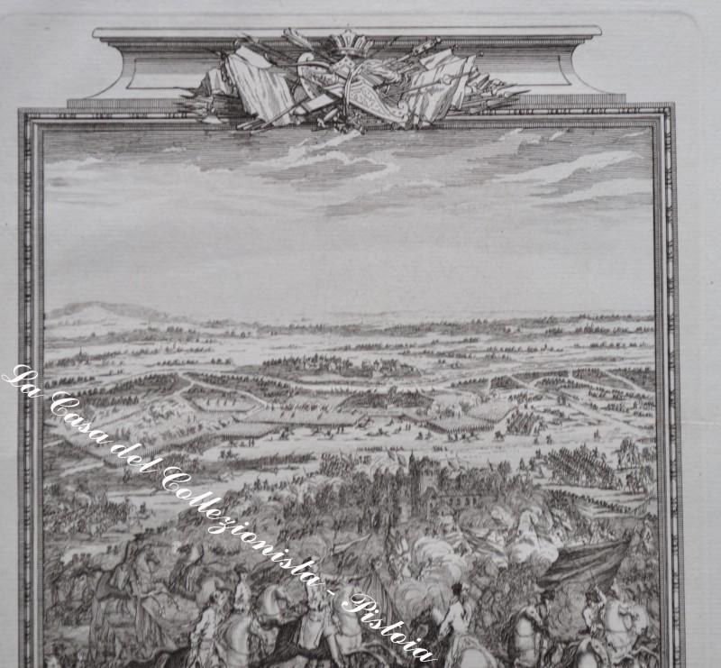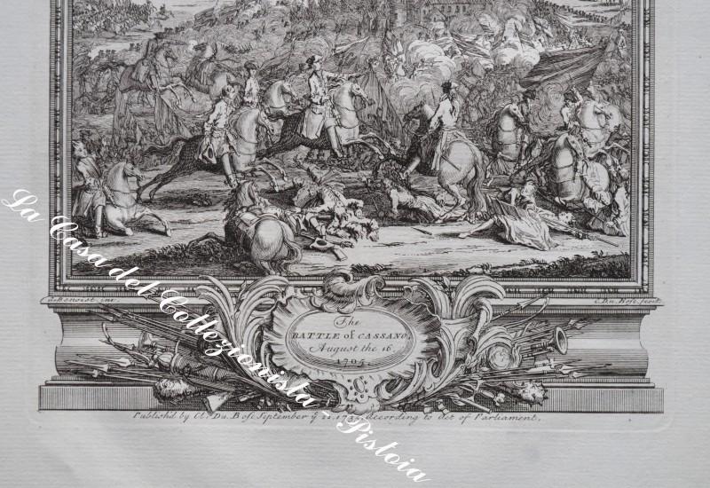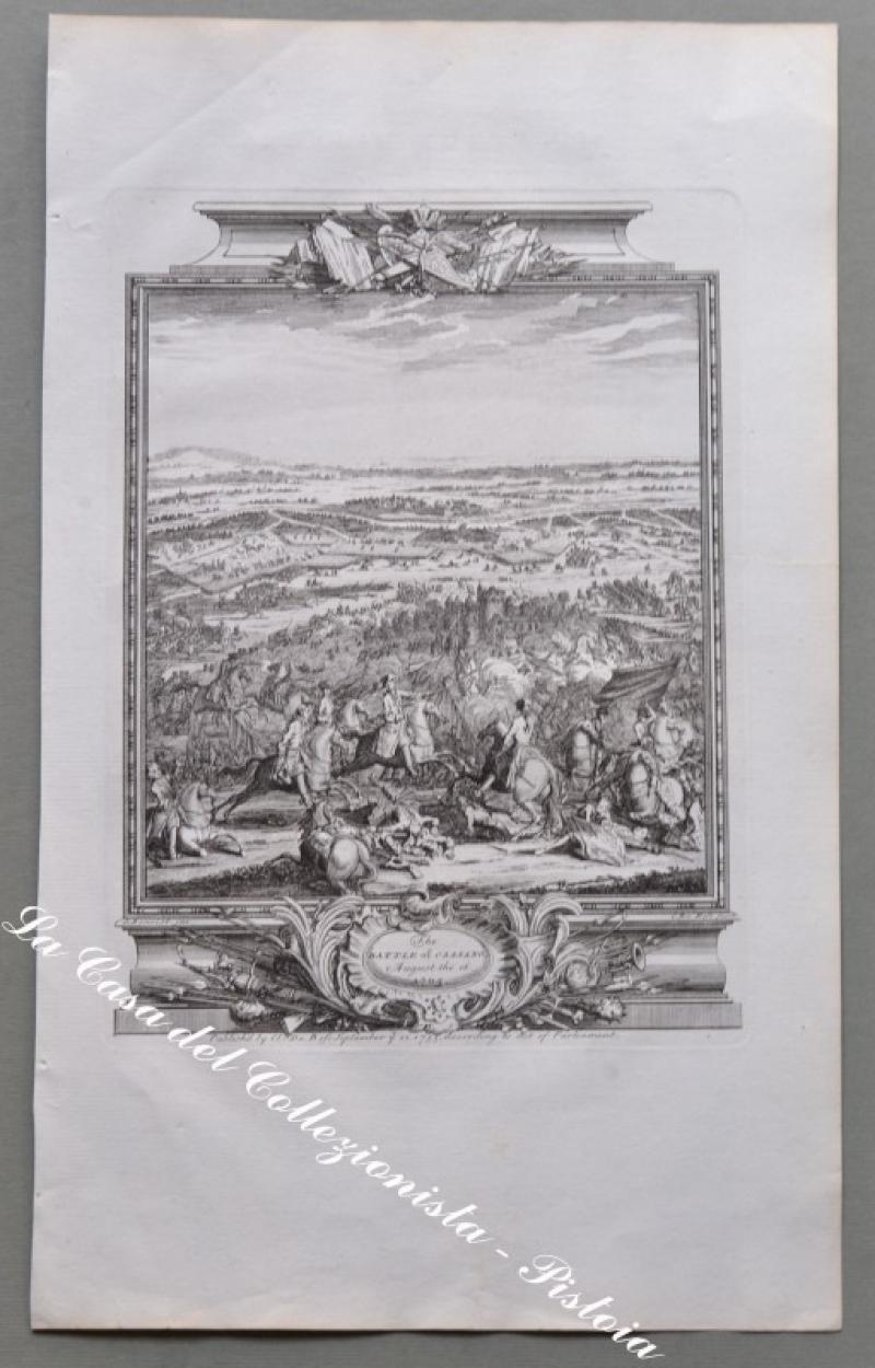 LOMBARDIA – CASSANO. "The battle of Cassano 1705”. Du Bosc fec., Benoist inc., circa 1750. Incisione su rame, mm 185x285 (ai margini 245x405). Bella veduta della città e territorio col principe Eugenio e cavalieri in primo piano. Ottima conservazione. (Rif.D1901 - 199/65)
