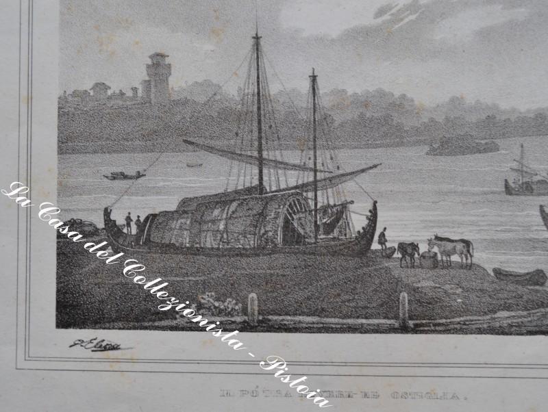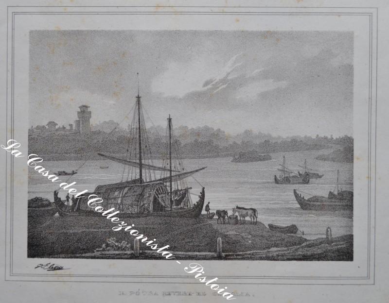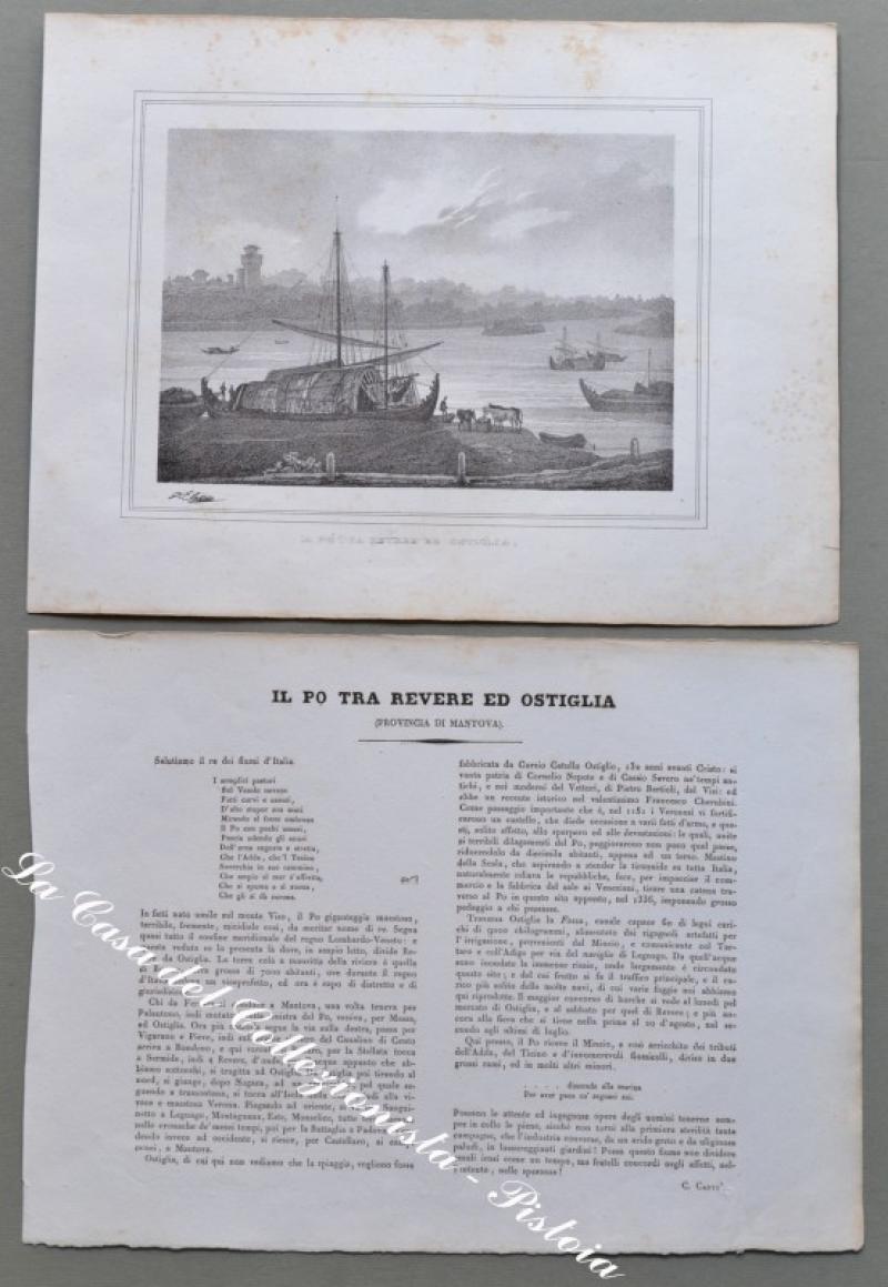 LOMBARDIA. "Il Po tra Revere e Ostiglia”. Elena dis., 1830 circa. Litografia di mm 225x168 (ai margini 317x240). Pittoresca veduta con barche in primo piano e paese sullo sfondo. Unito foglio di testo descrittivo. Conservazione buona, ingiallimenti sul bordo bianco superiore. (Rif.D1886 - 197/65)