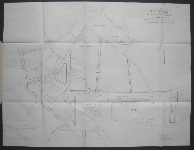 (Lombardia) MILANO. Due grandi tavole più volte ripiegate tratte dal Giornale dell'Ingegnere Architetto del 1860. La I° (mm 670x510) mostra "Planimetria della parte centrale di Milano col progetto della Nuova Piazza intorno al Duomo" e di sistemazione delle adiacenti vie principali. La II° (mm 500x230) mostra la veduta della nuova piazza. Unita la memoria relativa (stralcio di pagine 5). (Rif.A8178-337/47)
