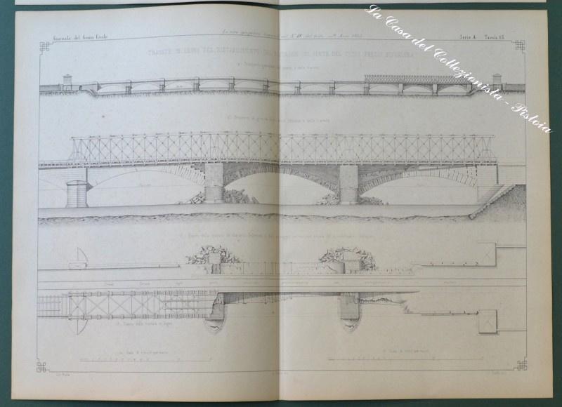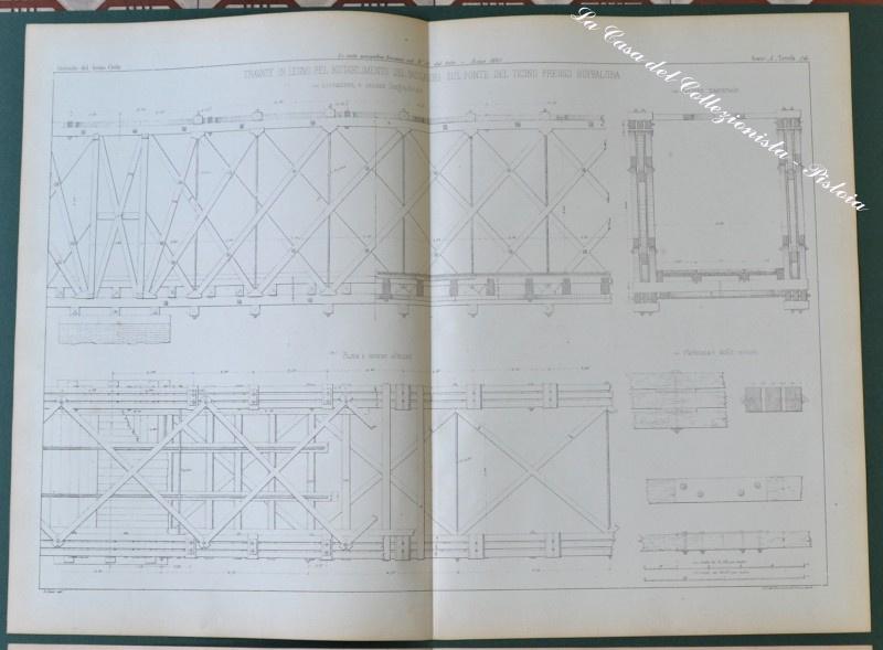 LOMBARDIA. "Travate in legno pel passaggio sul ponte del Ticino presso Buffalora”. Due tavole ciascuna di mm 545x400, tratte da Giornale del Genio Civiledel 1865. Prospetto generale dell’intero ponte, prospetto degli archi rovinati e delle travate, pianta e particolari tecnici. (Rif.D3830 - 325/67)