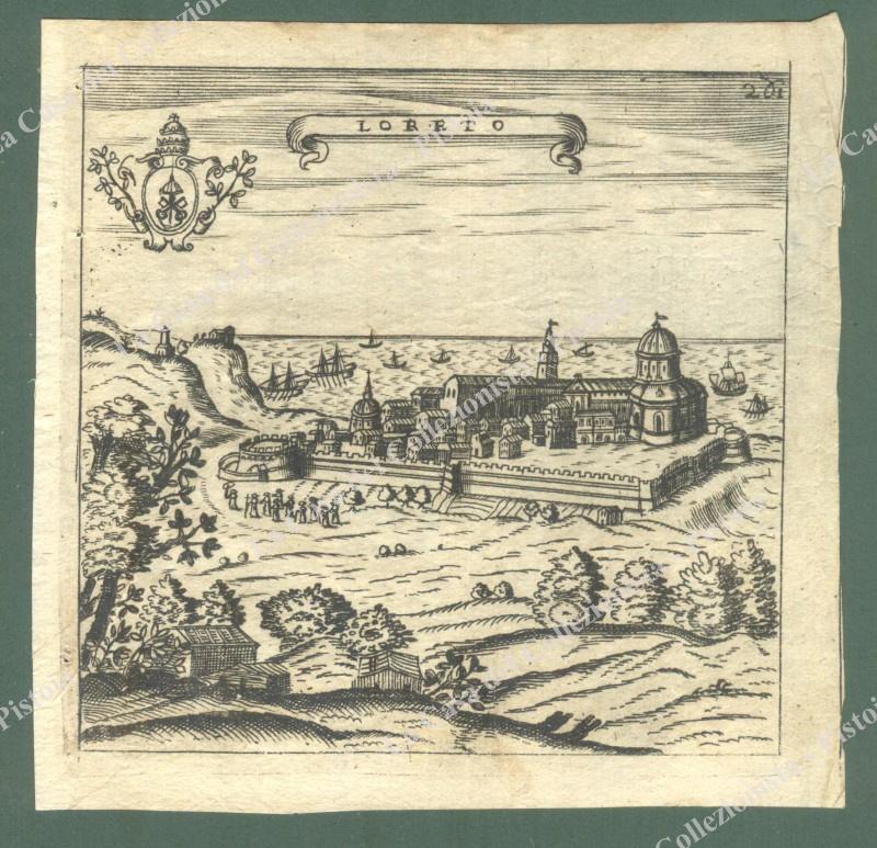 LORETO, 1685. Veduta generale. Incisione all'acquaforte di mm 119x117 più margini. Tratta dall'opera di Francesco Scoto "Itinerario, overo nova descrittione de' viaggi principali d'Italia", edita in Venezia nel 1670 presso Gio. Pietro Brigonci nel 1685. Ripiegata (proviene da libro). (Rif.E2226)
