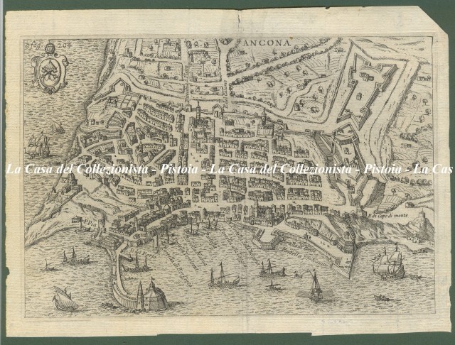 MARCHE - ANCONA. "Ancona". La città e i suoi dintorni visti a volo d'uccello. Molte navi in mare. Acquaforte di mm 177x121 (ai marg. 191x140) tratta dall'opera di F. Scoto, Roma anno 1650. Strappetto di pochi mm al bordo bianco superiore e piccola mancanza all'angolo bianco alto destro. (Rif.B6108-470/59)