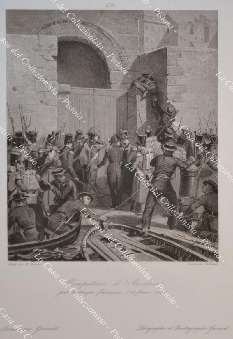 Marche. ANCONA. Occupation d'Ancone par les troupes francais 23 fevrier 1832. Incisione su matrice di acciaio realizzata da Thibault su disegno di Vernet, circa anno 1835. Mm 150x175 più grandi margini. (Rif.D8297)