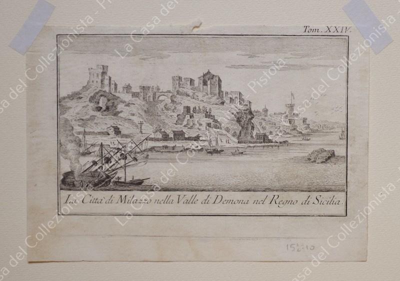 MILAZZO. Veduta generale. Acquaforte. Salmon, ediz. di Venezia, circa 1750.