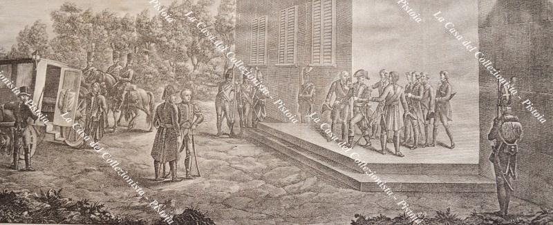 NAPOLEONE. "CONFERENZA DI UDINE". Grande incisione all'acquaforte tratta dall'opera di De Norvins, circa 1840. Misura mm 415x170 (ai margini mm 445x210). Ripiegata perchè contenuta in un libro come tavola fuori testo. Montata in passepartout in carta dell'epoca. Buona conservazione. (Rif.F6443)