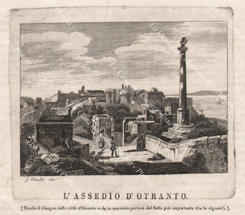 OTRANTO, veduta panoramica. Acquaforte di mm 110x80 tratta da L'Omnibus, anno 1838. Viene proposta montata in passe-partout di cartoncino spesso con taglio inclinato, decorato con filo di colore all'acquarello e filo d'oro. (Rif.A2458 - Puglia - Otranto)