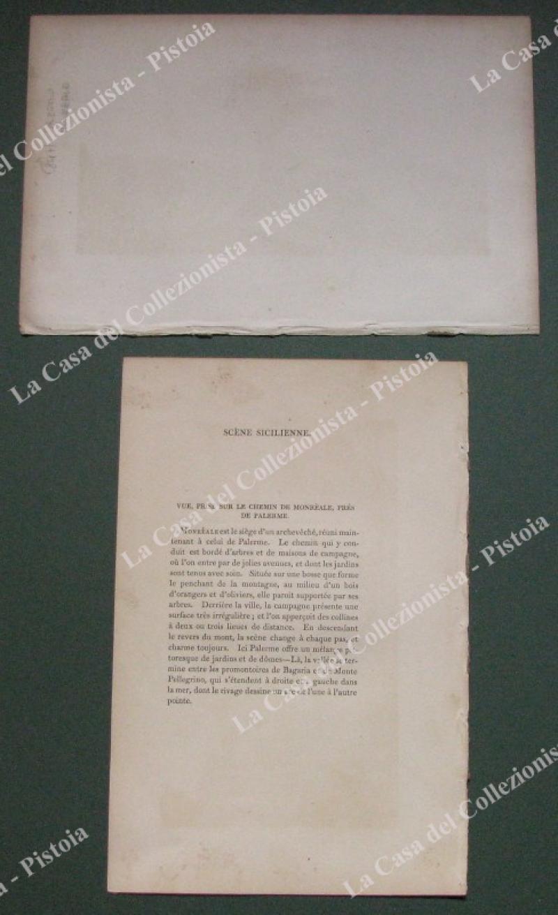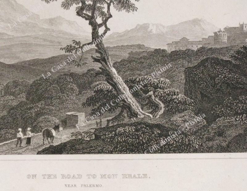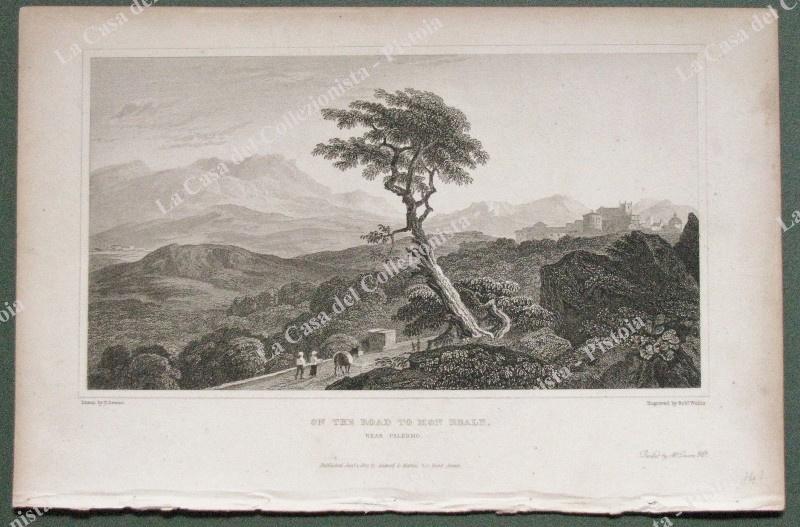 PALERMO dintorni. 1823. "ON THE ROAD TO MON REALE". Incisione di Wallis, tratta da SICILIAN SCENERY di M.Light, Londra 1823. Mm 210x117 (ai margini 270x175). Unita pagina di testo descrittivo. Buona conservazione, leggera spellatura sul margine bianco laterale destro. (Rif.E2309)