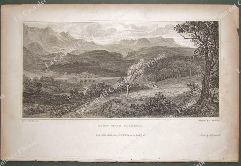 PALERMO dintorni. 1823. "VIEW NEAR PALERMO". Incisione di Westwood, tratta da SICILIAN SCENERY di M.Light, Londra 1823. Mm 217x108 (ai margini 270x175). Unita pagina di testo descrittivo. Buona conservazione. (Rif.E2303)