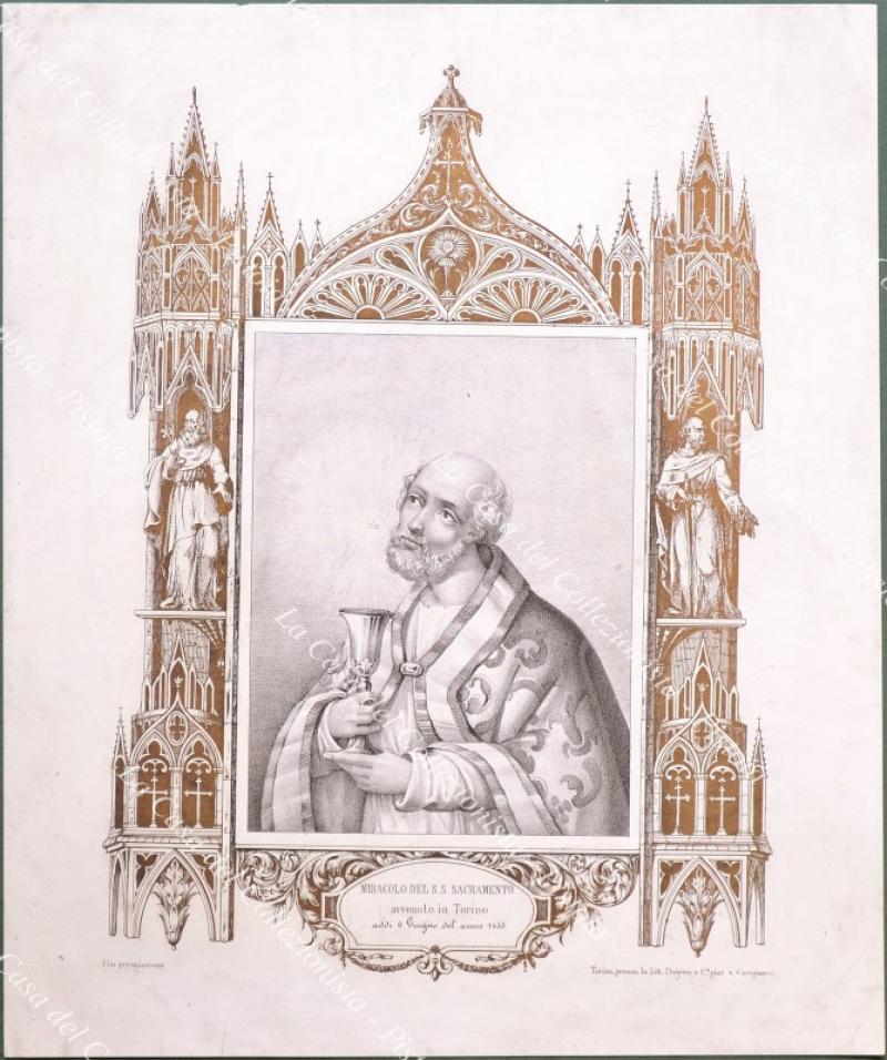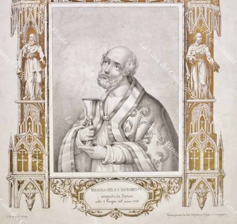PIEMONTE – TORINO. “MIRACOLO DEL SS. SACRAMENTO avvenuto in Torino addì 6 giugno 1453”. Litografia in nero e oro, mm 280x330 ai margini; Torino, Lit. Doyen, circa 1860. Piccole imperfezioni. (Rif.D9181-303/72)