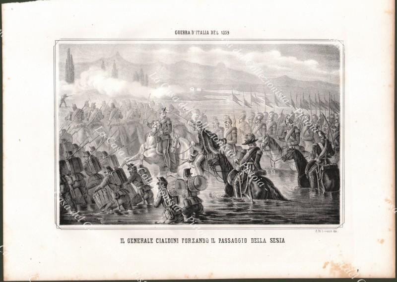 Risorgimento. PIEMONTE. Il Generale Cialdini forzando il passaggio della Sesia. Mm 260x170 più margini. Bella tavola, finemente eseguita in litografia da Riccio su disegni di Di Lorenzo, tratta dall'opera di Domenico Valente La Guerra d'Italia del 1859, edita a Napoli da Duclere nel 1860. Buona conservazione. (Rif.D8335)