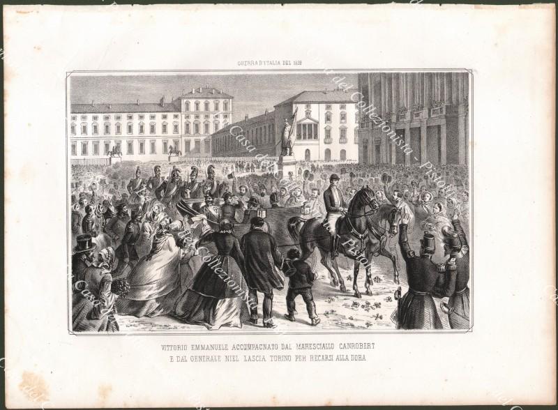 Risorgimento. Piemonte. VITTORIO EMMANUELE LASCIA TORINO PER RECARSI ALLA DORA. Mm 260x170 più margini. Bella tavola, finemente eseguita in litografia da Riccio su disegni di Di Lorenzo, tratta dall'opera di Domenico Valente La Guerra d'Italia del 1859, edita a Napoli da Duclere nel 1860. Buona conservazione. (Rif.D8336)