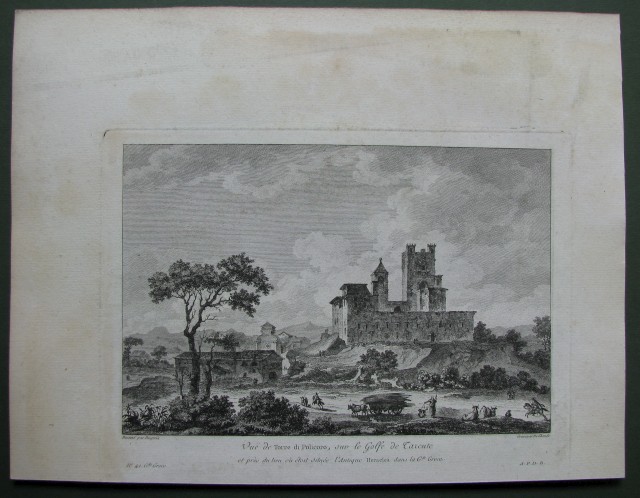 POLICORO (Matera), "Vue de Torre di Policoro, sur le Golfe de Tarente". Deliziosa veduta generale del castello e del borgo. In primo piano uomini e animali. Bella e decorativa. Mm 218x146 (ai marg. mm 315x42). Realizzata su carta vergellata proviene dall'edizione del 1781 dell'opera di Saint-Non VOYAGE PITTORESQUE A NAPLES ET EN SICILE. Splendida e fresca conservazione. (Rif.B944-514/49)