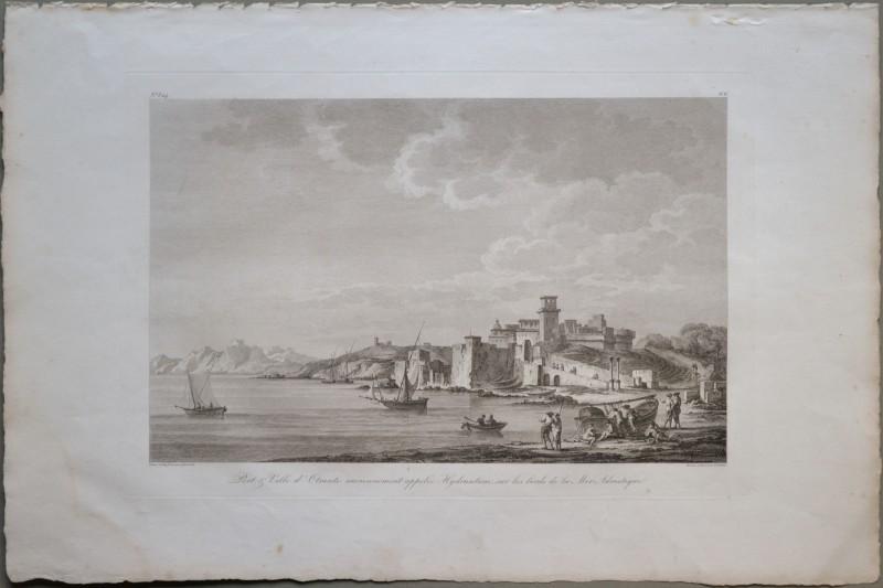 PUGLIA – OTRANTO. “PORT ET VILLE D’OTRANTE anciennemente appelèe Hydruntum, sur les bords de la Mer Adriatique”. Grande e bella veduta animata da barche e personaggi tratta da “Voyage Pittoresque de Naples et de Sicile” di Saint-Non, ediz. di Parigi del 1830. Acquaforte di mm 355x230 (ai margini 535x360). Ottima conservazione. (Rif.D4496 - 147/68)