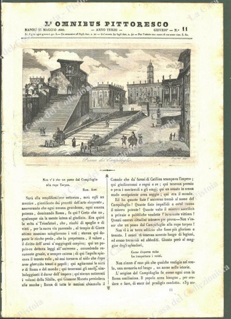 ROMA. "Piazza del Campidoglio". Bella animata incisa all'acquaforte di mm 155x100. Tratta da L'Omnibus Pittoresco anno 1840. Conservato l'intero di pp.8 con l'articolo relativo. (Rif.E2338)
