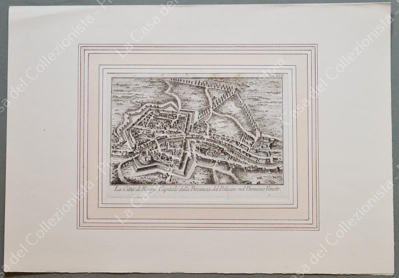ROVIGO, Veneto. La città di Rovigo Capitale della Provincia del Polesine nel Dominio Veneto. Veduta generale. Salmon, 1753, Venezia. Tavola di mm 222x140 più margini bianchi, incisa all'acquaforte. Più volte ripiegata (proviene da libro). Buona conservazione, lievi ingiallimenti. (Rif.F6270)