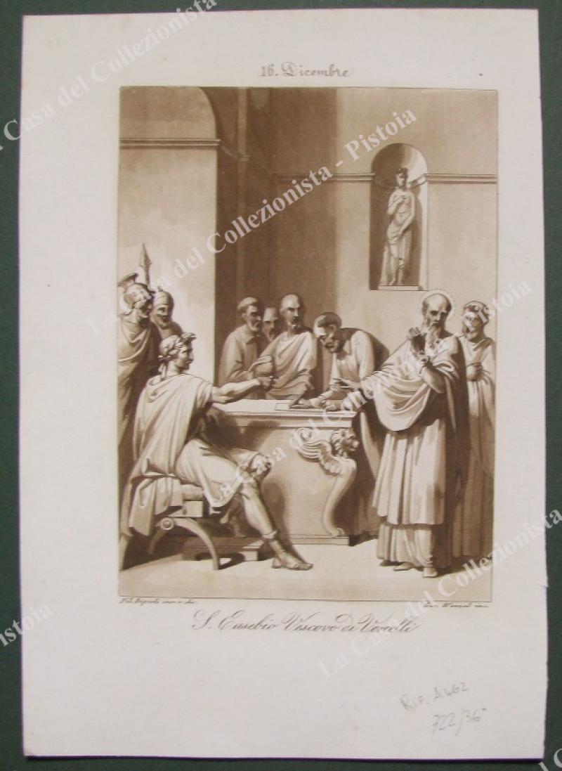 S.EUSEBIO VESCOVO DI VERCELLI. Bella tavola assai fine e curata, incisa all’acquatinta in color seppia da Wenzel su disegno di F.Bigioli è tratta da "Il perfetto leggendario ovvero vite de’ Santi per ciascun giorno dell’anno”, opera edita in Roma attorno al 1840. Misura mm 184x262 ai margini e impressa su carta grave. (Rif.A462-722/36)