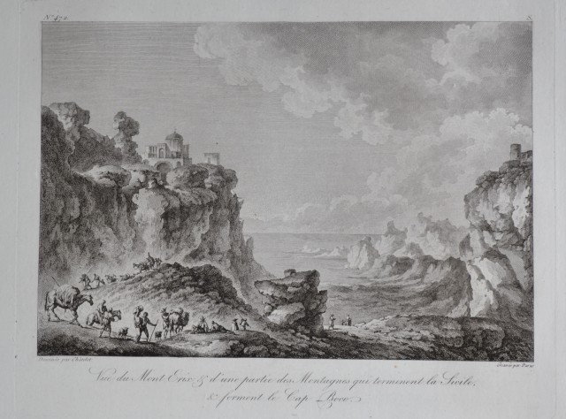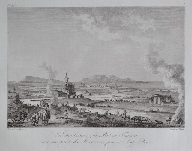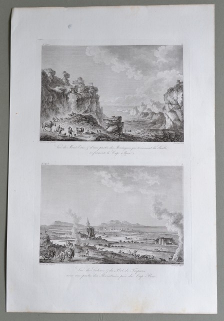 SICILIA - TRAPANI. Insieme di due vedute in unico foglio di mm 334x500: 1) 'Vue du Mont Erix & d'une partie des Montagnes qui terminent la Sicile, & forment le Cap Boco'. Bella panoramica veduta, animata da persone e animali. Mm 230x155. 2) 'Vue des Salines & du Port de Trapani avec une partie des Iles situèes près du Cap Boco'. Veduta generale assai animata. Mm 230x155. Da Saint-Non, Parigi 1836. Ottima conservazione. (Rif.C3225-503/59)