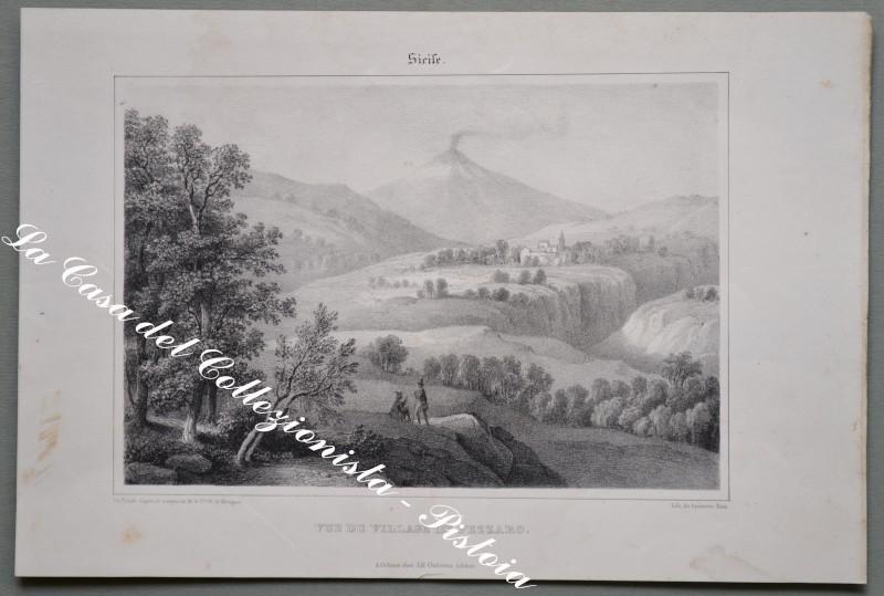 SICILIA – MESSINA dintorni. Vue du village de Pezzaro, frazione di Antillo in provincia di Messina. De Morogues dis., Lemercier Lit., 1828. Litografia di mm 205x140 (ai margini 290x195). Finissima splendida panoramica con l’Etna sullo sfondo. Rara e decorativa. (Rif.D1873-251/65)